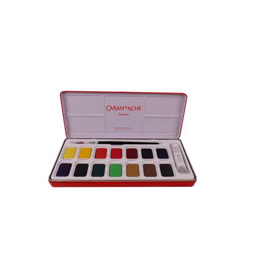 Farbkasten-Set von CARAN D'ACHE mit 7 oder 14 Farbtabletten, plus einer 10 ml Tube Deckweiß und einem Pinsel Größe 5. Gouache ist eine Farbe mit natürlichen Bindemittel und verfügt über eine hohe Pigmentkonzentration. Sie ist matt, gut deckend, bleibt geschmeidig und wird nicht rissig. Nach dem Trocknen wieder wasserlöslich.