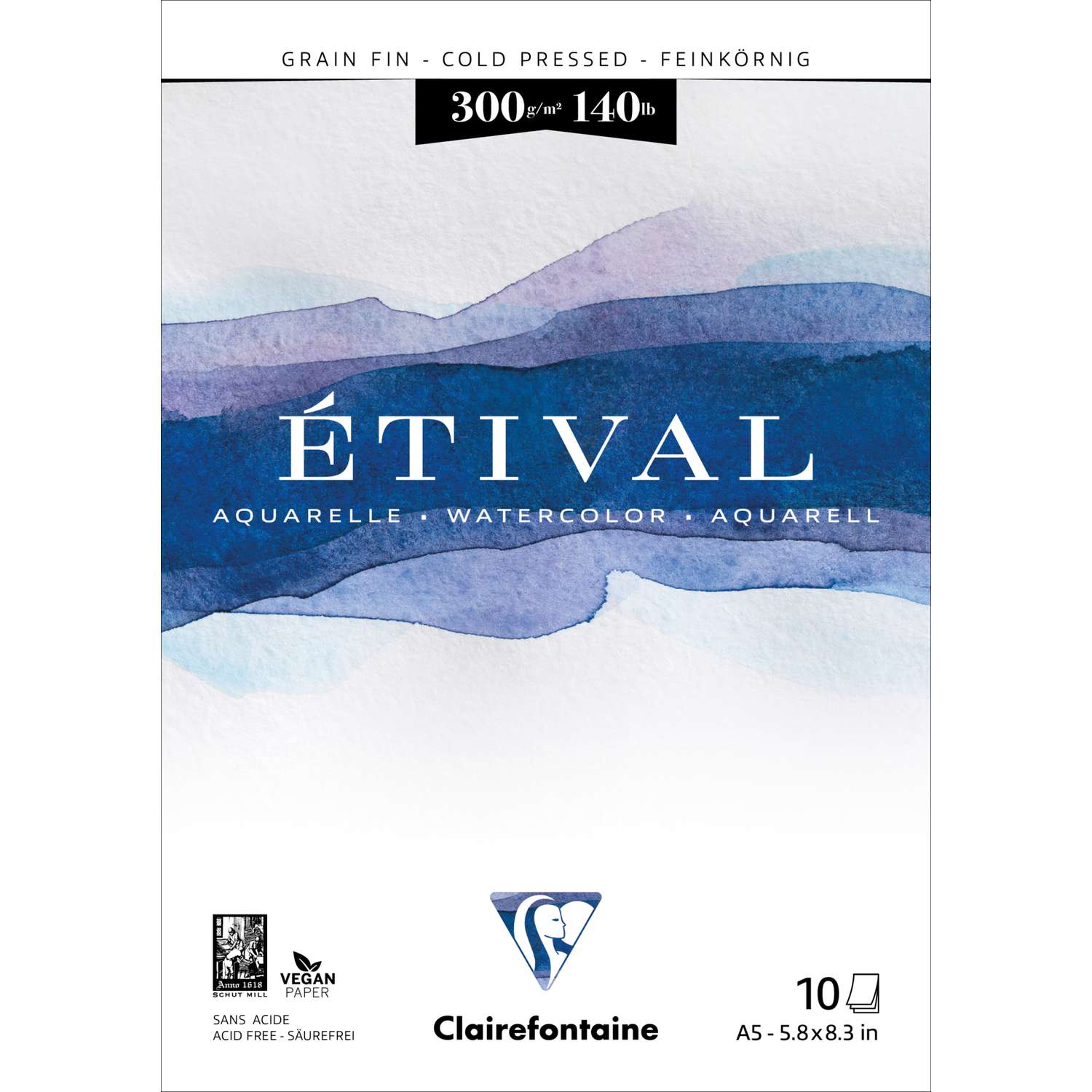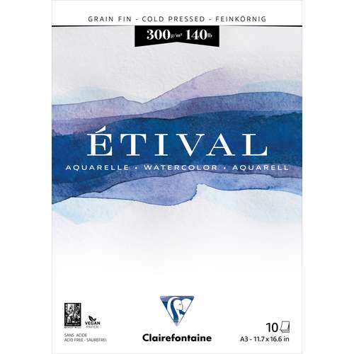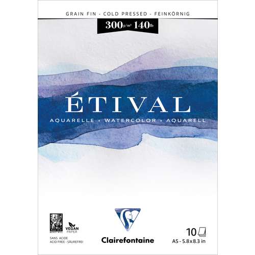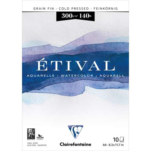 Der Clairefontaine ETIVAL Aquarellblock 300 g,feinkörnig istkopfgeleimt. Ein lichtbeständiges und sehr absorptionsfähiges Aquarellpapier aus 100 % Zellstoff mit einem natürlichen Weiß. Der Clairefontaine ETIVAL Aquarellblock feinkörnig ist ideal für Anwendungen im Naßbereich.