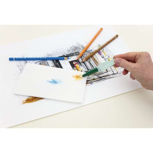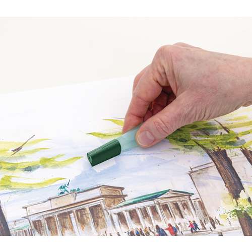 - Mit der keilförmig gestalteten Seite der Verschlusskappe lässt sich angelöste Farbe leicht auf dem Papier verschieben und erzeugt so ungewohnte, wie mit einem Malmesser gestaltete Strukturen.