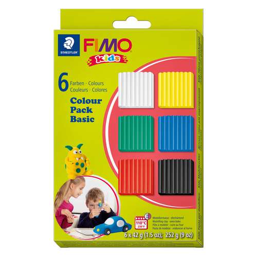 FIMO® Kids Colour Pack "Basic" mit 6 Blöcken weicher Modelliermasse in den gängigen Basisfarbtönen Weiß, Gelb, Rot, Blau, Grün und Schwarz. FIMO® Kids ist speziell für Kinder entwickelt, regt die Fantasie an und fördert Feinmotorik und Kreativität.