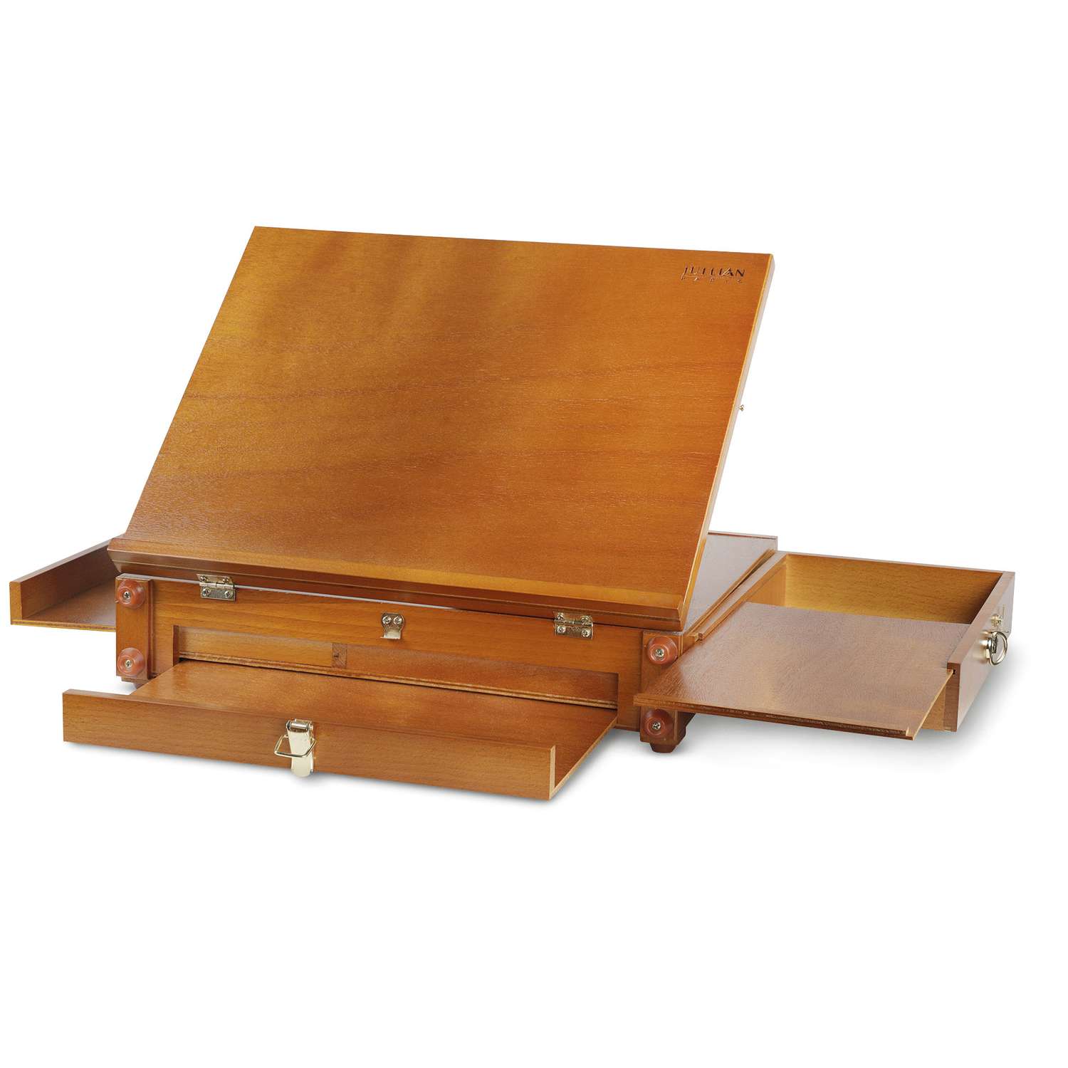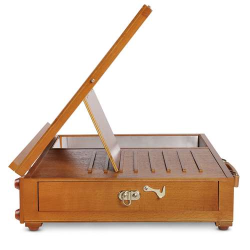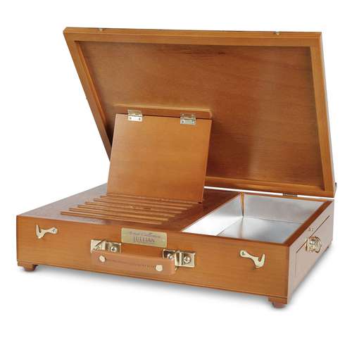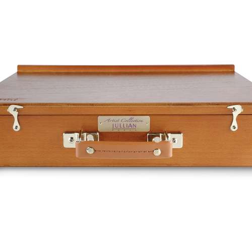 Die hochwertige JULLIAN Kofferstaffelei Pochade ist aus lackiertem Buchenholz gefertigt und bietet trotz der kompakten Größe und des geringen Gewichts von 3 kg viel Platz für Malutensilien. Sie verfügt im Inneren über ein geräumiges Metallfach und ein seitliches Schubfach. Darüber hinaus bietet sie 2 ausziehbare Ablagen und 1 Holzpalette. Gummierte Füße sorgen für stabilen Halt. Messingscharniere und Verschlüsse halten alle Schubladen und Ablagen beim Transport sicher verschlossen. 8-fach in der Neigung verstellbar sowie eine flache Einstellung für z. B. Aquarellmalerei. Die Staffelei lässt sich bequem mit dem veganen Kunstleder-Griff tranbsportieren und ist ideal für Malreisen.