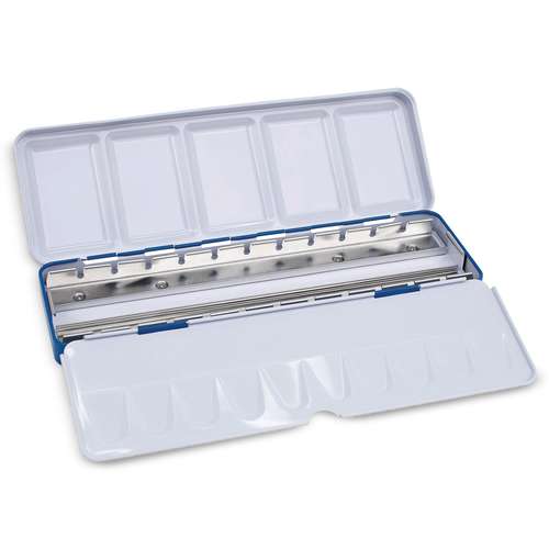 Blaue Metallbox für 12 oder 24 MILAN halbe Aquarell-Näpfchen. Mit Mischpalette und Haltering. Kompakt, robust und ideal für unterwegs. Mehr