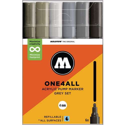 MOLOTOW™ ONE4ALL ist ein einzigartiges, vielfältiges und nachhaltiges Farbsystem auf Acrylbasis, dass sich individuell an alle kreativen Bedürfnisse anpassen lässt: Alle Pumpmarker sind wiederbefüllbar und die Spitzen (Tips) lassen sich schnell und einfach austauschen. Die Farbe haftet auf fast allen Oberflächen im Innen- und Außenbereich (Untergrund auf Eignung testen) und kann mit allen Auftragswerkzeugen verarbeitet werden. Das Farbsystem ist zu 100% kompatibel mit der MOLOTOW™ Sprühdosen-Linie und ermöglicht so eine weitreichende Crossover-Technik mit Pumpmarker und Sprühdose.