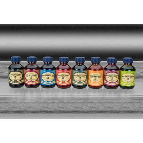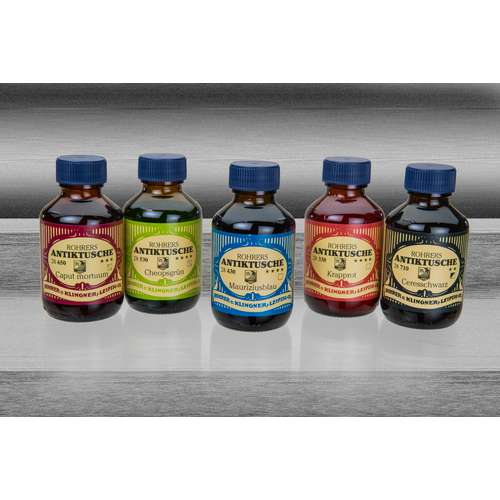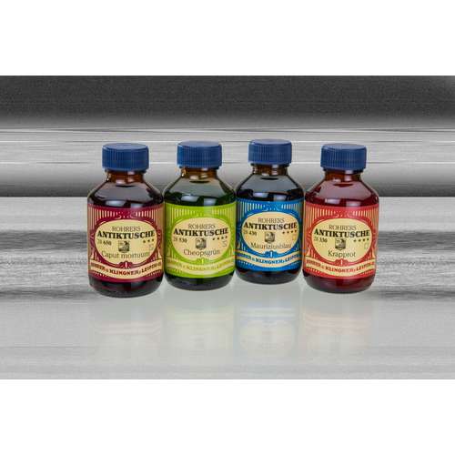 ROHRER's Antiktusche ist eine hochpigmentierte Tusche mit guter bis sehr guter Lichtechtheit. Die Farbtöne vereinen gute Benetzung, hohe Randschärfe und eine gute Tuschabgabe bei einer optimal eingestellten Trockenzeit. Dies lässt den Einsatz von Tuschefüllern (z. B. ArtPent von rotring, Best.-Nr. 30601) und natürlich allen anderen für die Kalligrafie in Frage kommenden Schreibgeräten zu. Außerdem ist ROHRER's Antiktusche auch für die Verarbeitung mit Spritzpistolen (Airbrush) bestens geeignet. Als Maluntergrund eignen sich Zeichenpapier, Zeichenkarton, Transparentpapier und mattierte Polyesterfolien. Für die Kalligrafie kommen auch stärker saugende Untergründe, wie Ingres-Bütten oder Aquarellpapier in Frage. Durch das eingesetzte Acrylharz-Bindemittel trocknen die Tuschen wisch- und wasserfest auf. Der Verzicht auf ein Netzmittel sorgt für einen optimalen Fluss, ohne dass die Tuschen verlaufen und in das Papier einschlagen. Alle 18 Farbtöne sind untereinander mischbar. Auch eine Kombination mit ROHRER's Zeichentusche ist möglich, wodurch sich zum Beispiel in Verbindung mit Gold und Silber interessante Metalliceffekte erzielen lassen. Erhältlich in der 100-ml-Flasche. – Preis pro Flasche.