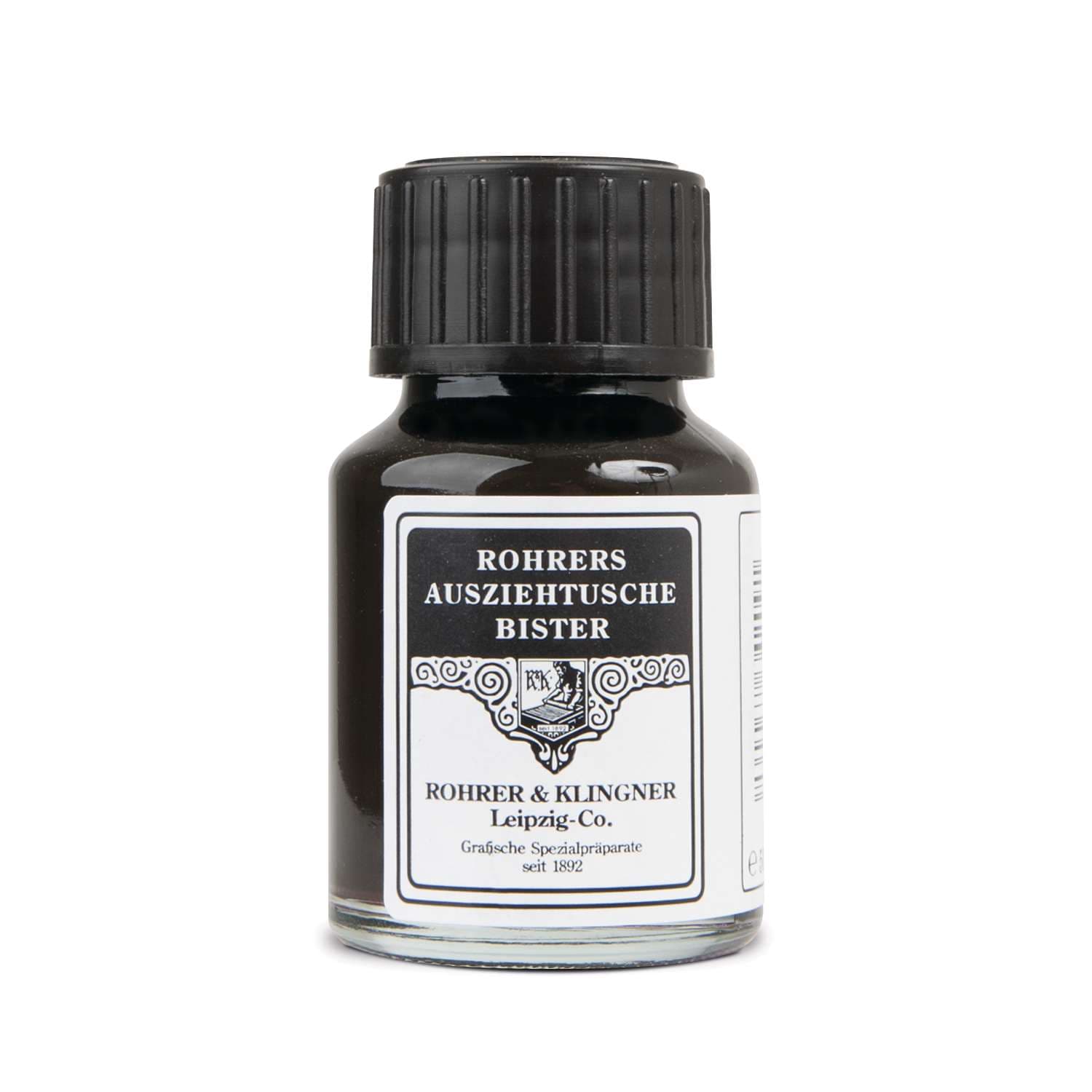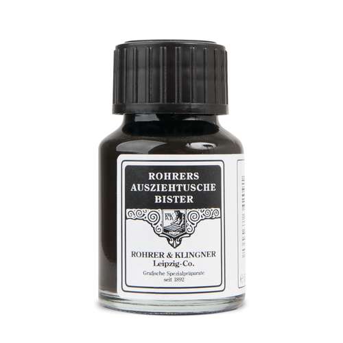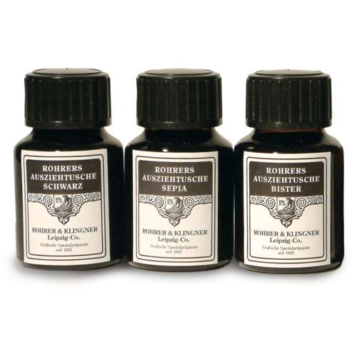 Eine wirkliche Spezialität in unserem Tuscheprogramm ist die ROHRER & KLINGNER Ausziehtusche Bister. Bereits im 13. Jahrhundert wurde Bister als Zeichenmittel verwendet. Bister ist ein warmer, klassischer Braunton, der von den großen Meistern, wie z. B. Rembrandt, als Ausdrucksmittel gern genutzt wurde. Er eignet sich sehr gut für Feder- und Pinselzeichnungen mit zarten Lavierungen. Weitgehend lichtbeständig. Der chemische Unterschied zu den Zeichentuschen liegt grundlegend im Bindemittel. Bei den Ausziehtuschen besteht dieses aus einer Schellacklösung und bei den Zeichentuschen aus einem Reinacrylat. – Preise pro Glas bzw. Flasche.