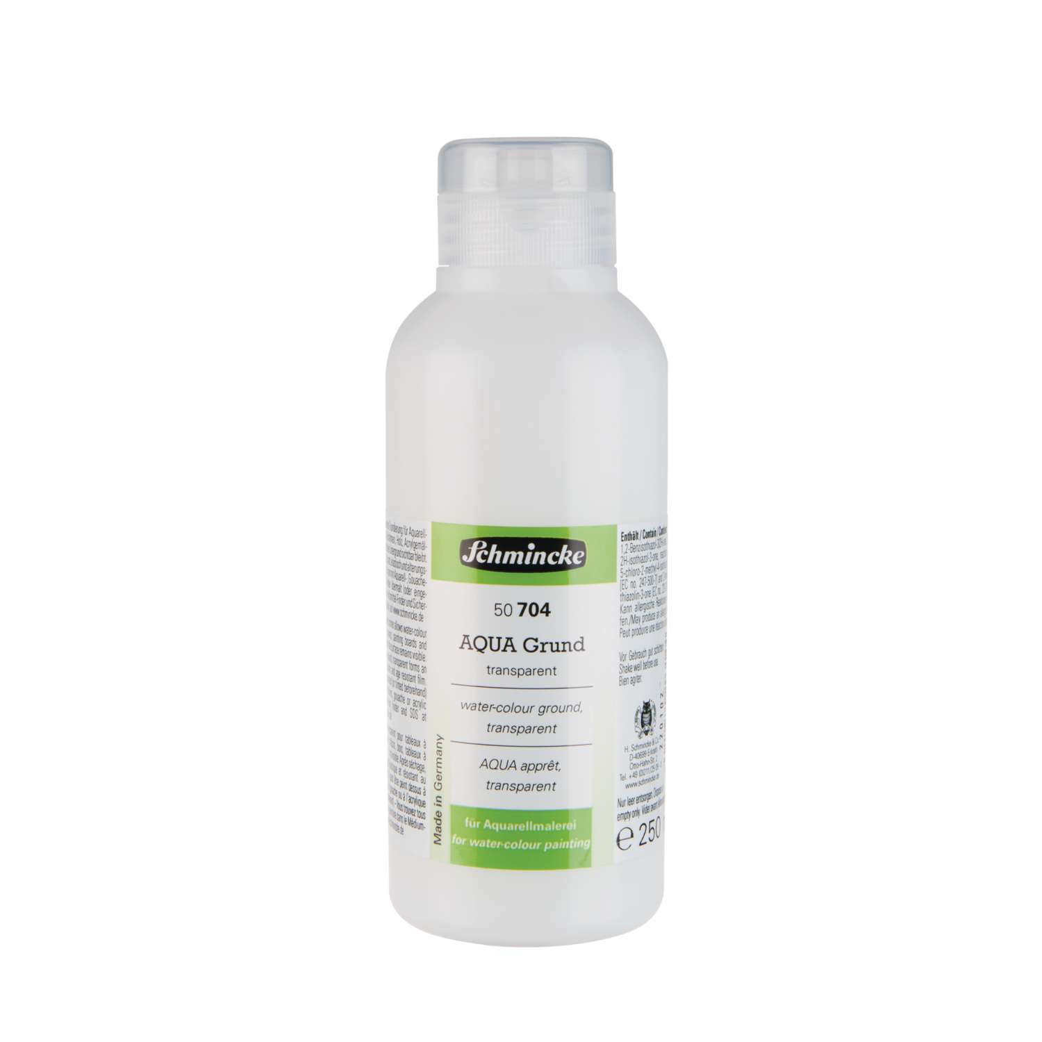 Mit SCHMINCKE AQUA Grund können Untergründe wie Leinwand, Malpappe etc. aqurellfähig gemacht werden. AQUA Grund fein für glatte Oberflächen wird mit dem Pinsel in drei Schichten dünn im Kreuzgang aufgetragen. AQUA Grund grob für aquarellartige Oberflächen wird aufgespachtelt. Nach dem Trocknen können die Untergründe bemalt werden. Nach Gebrauch Pinsel, Rolle oder Spachtel zügig mit Wasser und Seife reinigen. Lieferbar in verschiedenen Größen.