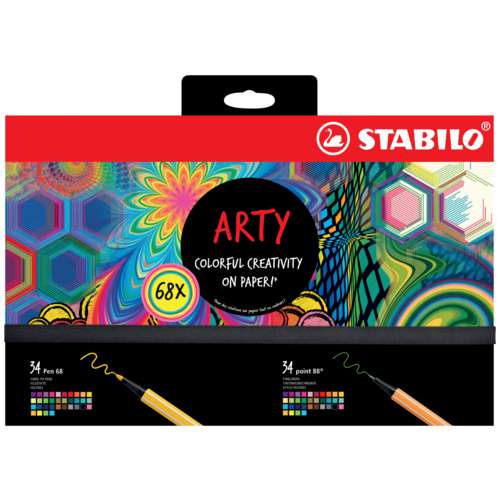 Das STABILO® ARTY Creative-Set enthält 68 qualitativ hochwertige Stifte: den Fasermaler STABILO Pen 68 und den Fineliner STABILO Pen 68 in je 34 Farbtönen. Ideal geeignet für zahlreiche Zeichentechniken.