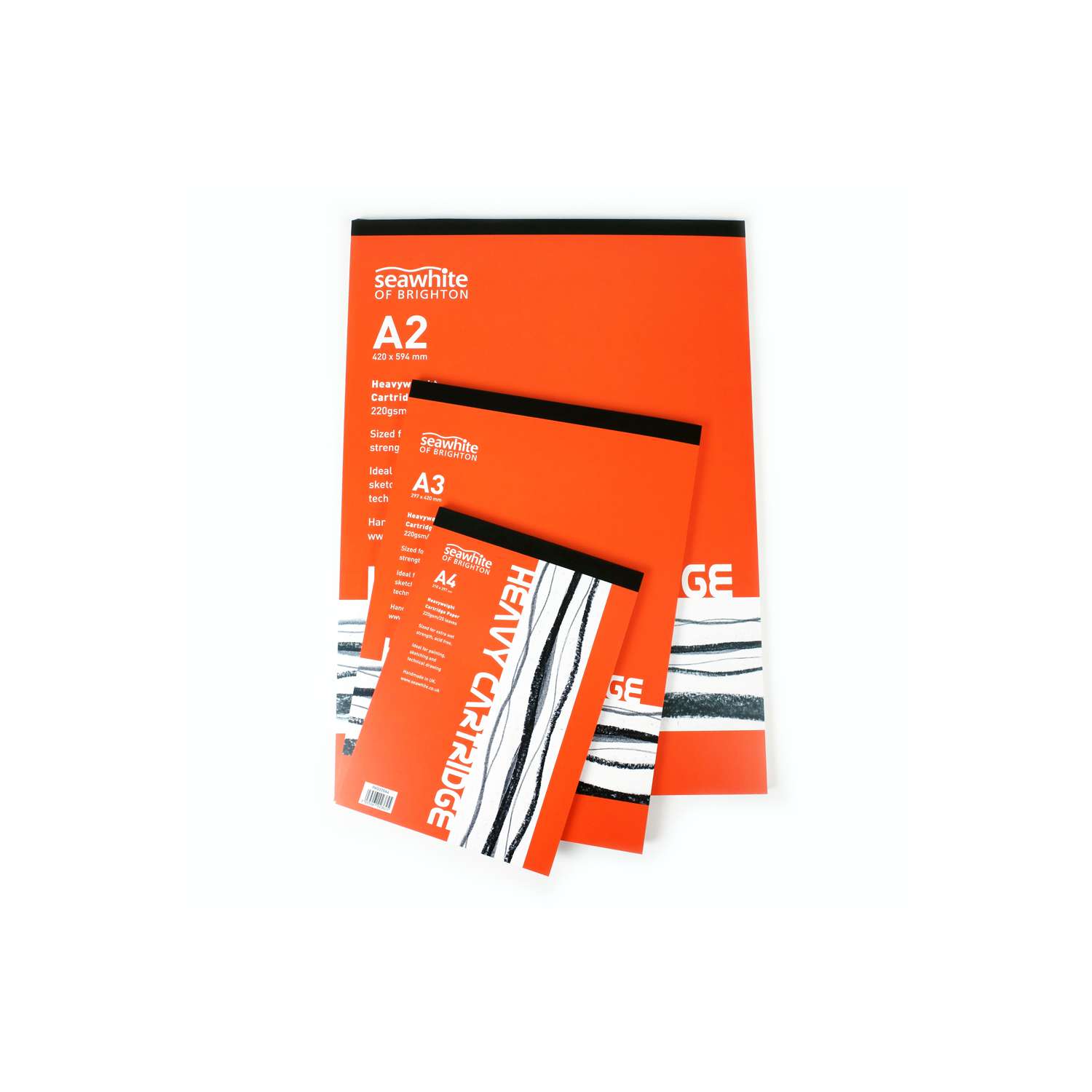 Diese hochwertigen Zeichenblöcke von seawhite of Brighton bieten mit ihrem 220 g/qm starken Papier eine ideale Grundlage für verschiedenste künstlerische Techniken. Ob Skizzen, technische Zeichnungen oder Malerei mit nassen Medien – die Heavyweight Cartridge Pads halten auch hoher Beanspruchung stand. Das Papier ist sowohl innen als auch außen geleimt, wodurch es besonders nassfest ist und sich kaum wellt. Zudem ist es frei von Säure und Chlor, was es besonders alterungsbeständig macht. Die Blöcke sind vegan und mit einem stabilen, 2 mm starken Rückenkarton versehen. Ein roter, bedruckter Deckel verleiht ihnen ein ansprechendes Äußeres. Sie sind am oberen Rand geleimt und zusätzlich mit Leinenband verstärkt.