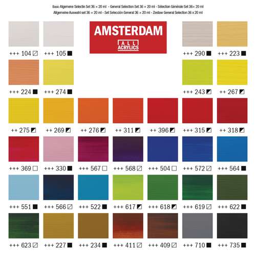 Talens AMSTERDAM Acrylfarbe "Standard Series" 36er-Set enthält Farben auf 100 % Acrylemulsion-Basis mit hochwertigen Pigmenten. Direkt gebrauchsfertig, cremige Konsistenz. Inhalt: 36 x 20-ml-Tuben.