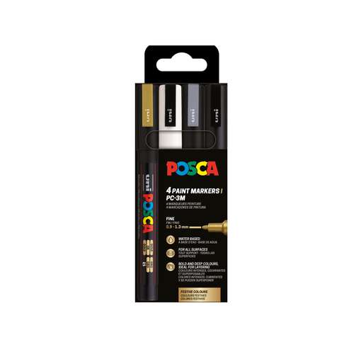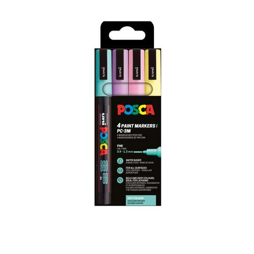UNI POSCA Marker-Set PC-3M, 4er-Set mit feiner Spitze, hervorragend für Kenner geeignet. Der UNI POSCA Marker PC-3M eignet sich zum Individualisieren, Gestalten, Dekorieren oder Markieren, zur Farbgebung oder Strichgestaltung. Seine feine Rundspitze und der schmale Schaft ermöglichen ein angenehmes Arbeiten.