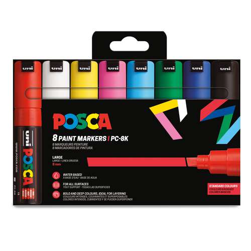Die UNI POSCA Marker PC-8K im Set überzeugen durch hohe Deckkraft und Lichtbeständigkeit. Sie sind hervorragend für jede Oberfläche. Die Farbe haftet dauerhaft und wasserfest auf rauen Oberflächen. Hingegen auf glatten Oberflächen, wie Glas mit einem feuchten Tuch abwischbar. Keine Durchschrift bei Papier. Ebenfalls kinderfreundlich, da auf Wasserbasis, geruchlos und ohne Alkohol oder Lösungsmittel.
