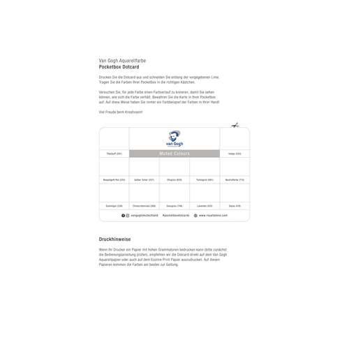 - Muted Colours: Titanbuff, Neapelgelb rot, Gummigutt, Gelber Ocker, Chinacridon Rosa, Olivgrün, Davygrau, Türkisgrün, Lavendel, Indigo, Neutralfarbe, Sepia