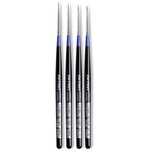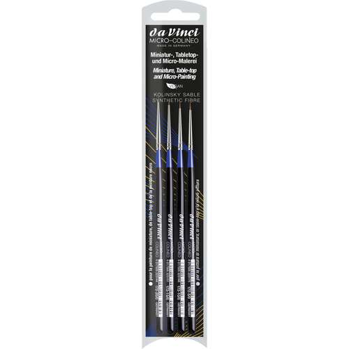 Das da Vinci MICRO-COLINEO Set, Serie 172, wurde speziell für feinste Detailarbeiten und Miniaturmalerei entwickelt. Es enthält vier hochwertige Pinsel mit synthetischen Kolinsky-Fasern, die durch hohe Elastizität, Formstabilität und exakte Spitzen überzeugen. Die kurzen Fasern sind besonders präzise und ermöglichen filigrane Striche, Linien und Details, wie sie in Grafik, Illustration, Modellbau oder bei Miniaturen gefordert sind. Dank der veganen Fasern bieten die Pinsel eine tierfreie Alternative zu Kolinsky-Rotmarderhaaren. Die Stiele sind kurz, handlich und für maximale Kontrolle ausgelegt. Ein ideales Set für Profikünstler, Studenten und Hobbykünstler, die präzise Ergebnisse erzielen möchten.