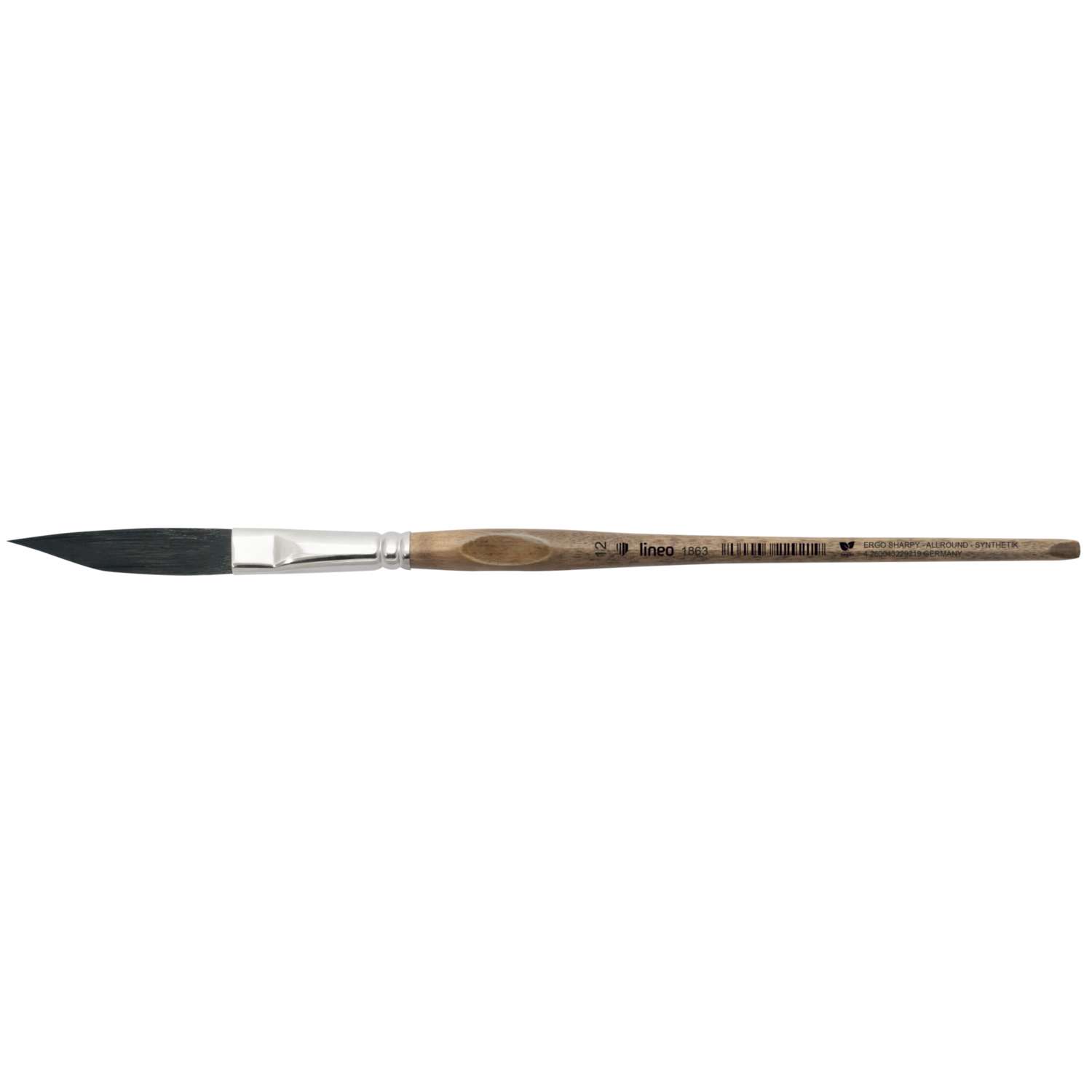 Der lineo ERGO SHARPY ALLROUND Serie 1863, Dolchschlepper ist ein Allroundpinsel mit spitz zulaufender Kante, ideal für präzises Ziehen langer Farbstriche und Schattierungen. Die schwarzen ERGO SHARPY ALLROUND Synthetikfasern eignen sich für Aquarell-, Acryl- und Ölfarben und ermöglichen kontrollierte Farbverläufe.