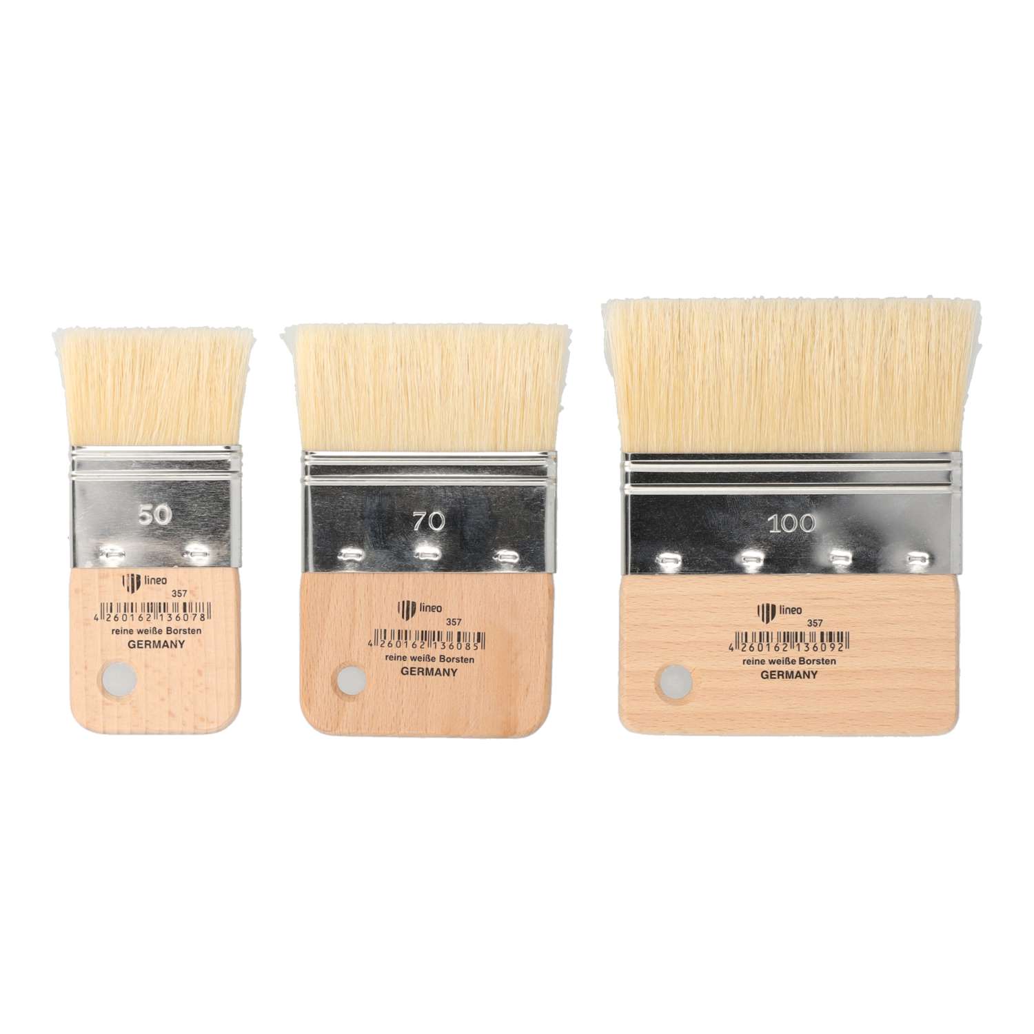 Die lineo Paddle Borstenpinsel der Serie 357 zeichnen sich durch ihre besonders breite, flache Form und einen kurzen, flachen Holzstiel aus. Gefertigt aus hochwertiger, besonders heller Naturborste (Hog Bristle), eignen sie sich hervorragend für kraftvolle Farbaufträge mit Öl- und Acrylfarben sowie Kasein.